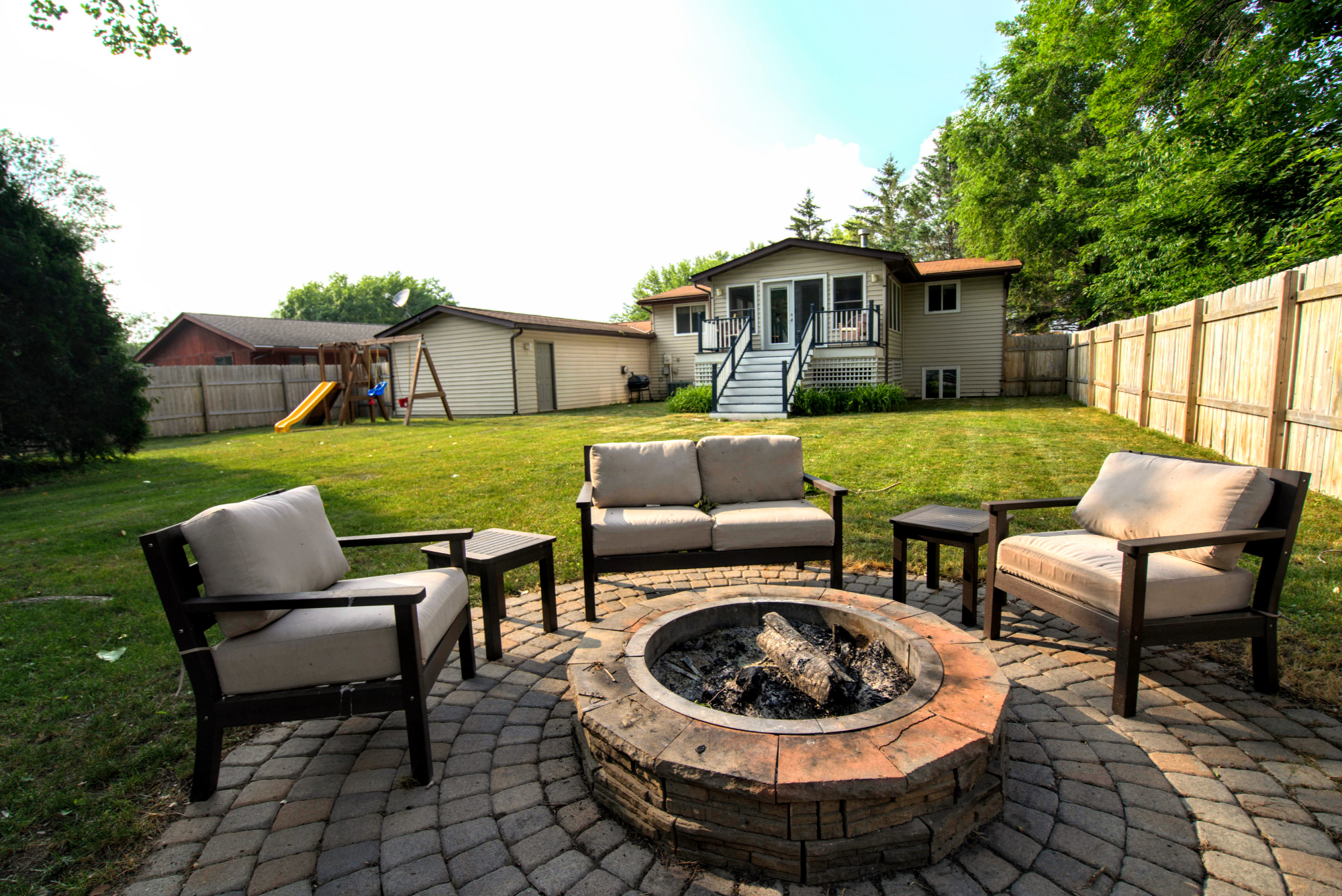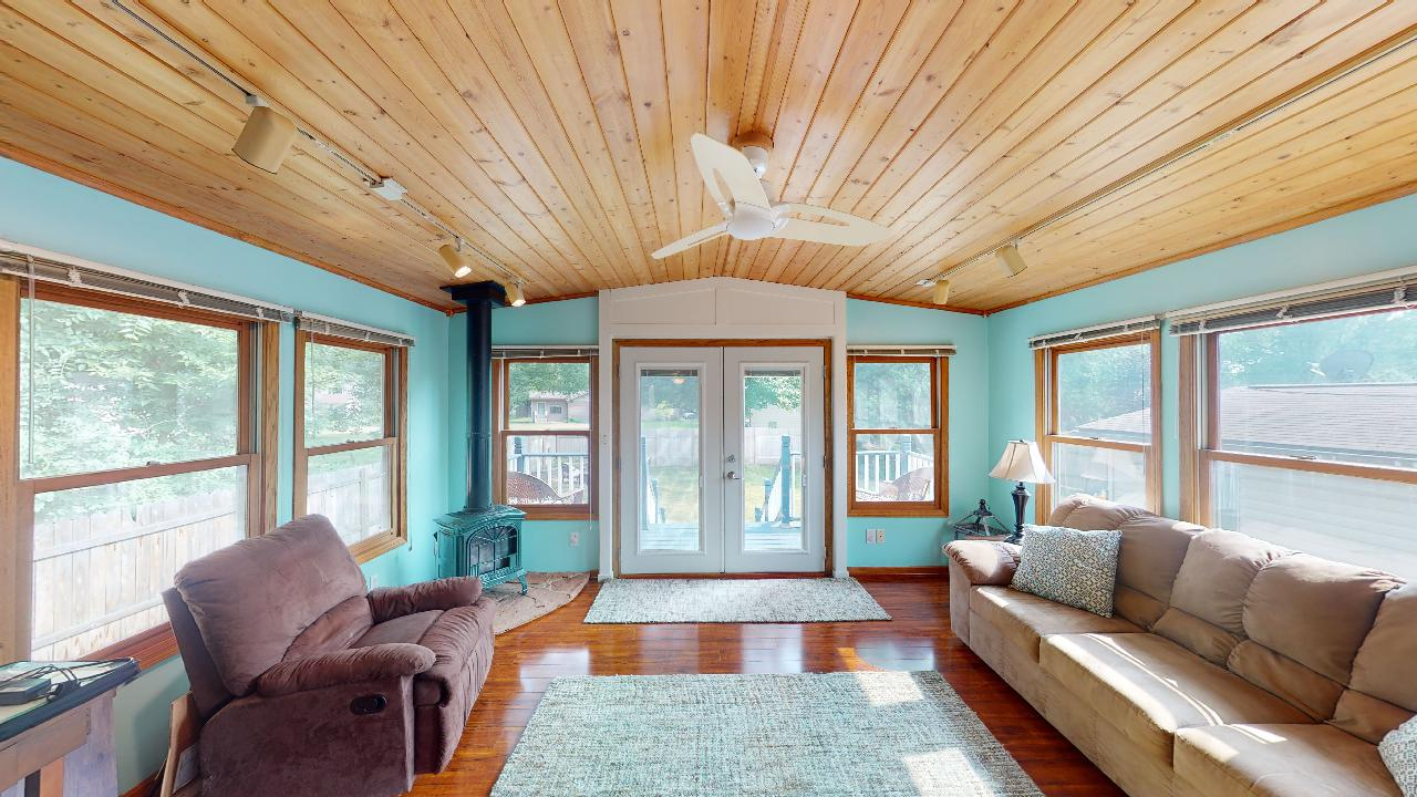 French doors lead into the four season porch with fireplace, vaulted wood ceilings and walkout access to the deck which overlooks a 0.22 acre lot with a wooden/privacy fenced backyard and firepit area. The main level also includes a full bathroom and two good-sized bedrooms--one of which has hardwood flooring.
