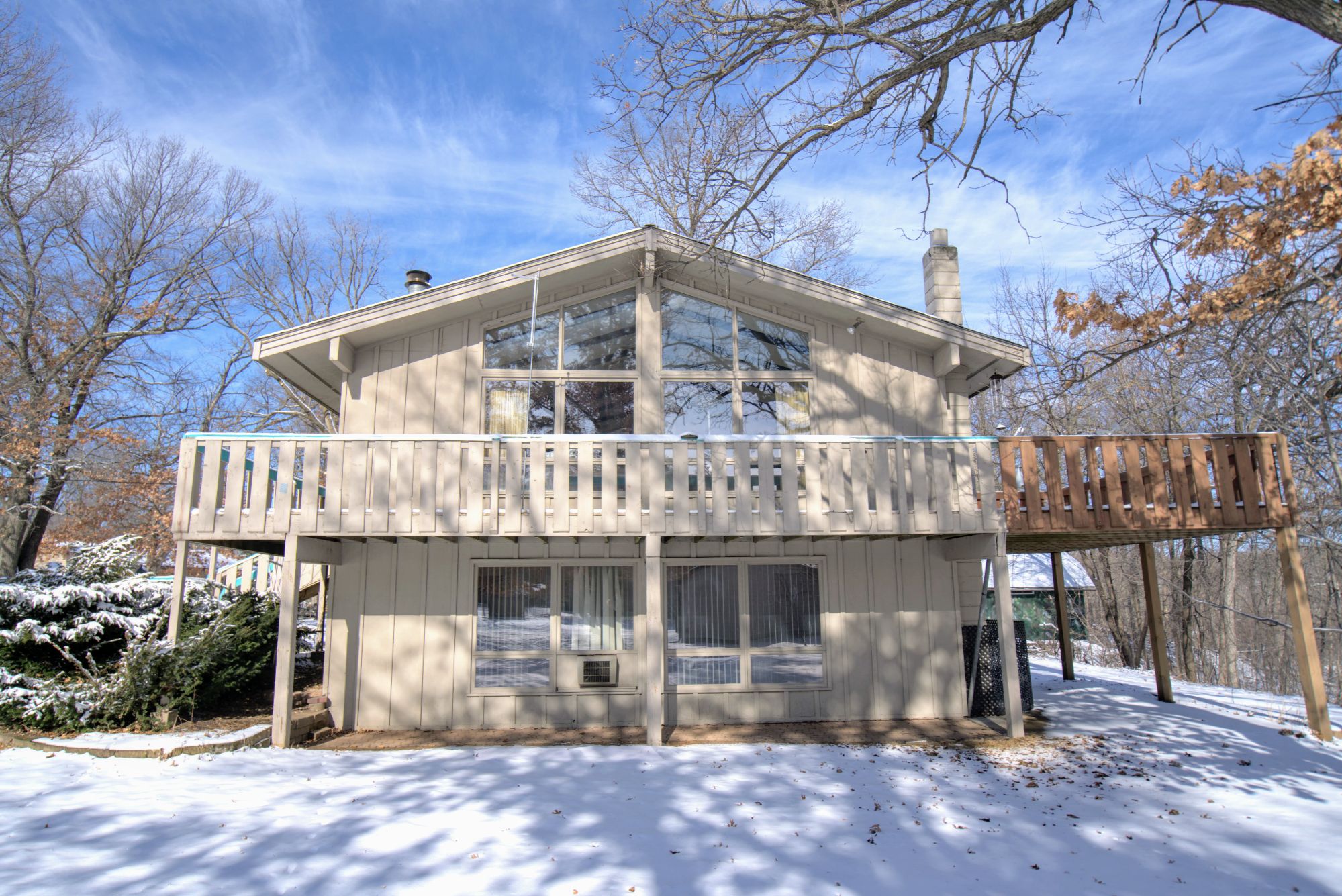 Inside the home, the main level features an open layout connecting the dining and living areas, highlighted by a vaulted ceiling and a striking full wall stone fireplace that serves as the focal point of the space. Large windows allow natural light to pour in while providing scenic views of the surrounding wooded landscape. The layout creates a warm and inviting environment that is ideal for everyday living as well as hosting family and friends.