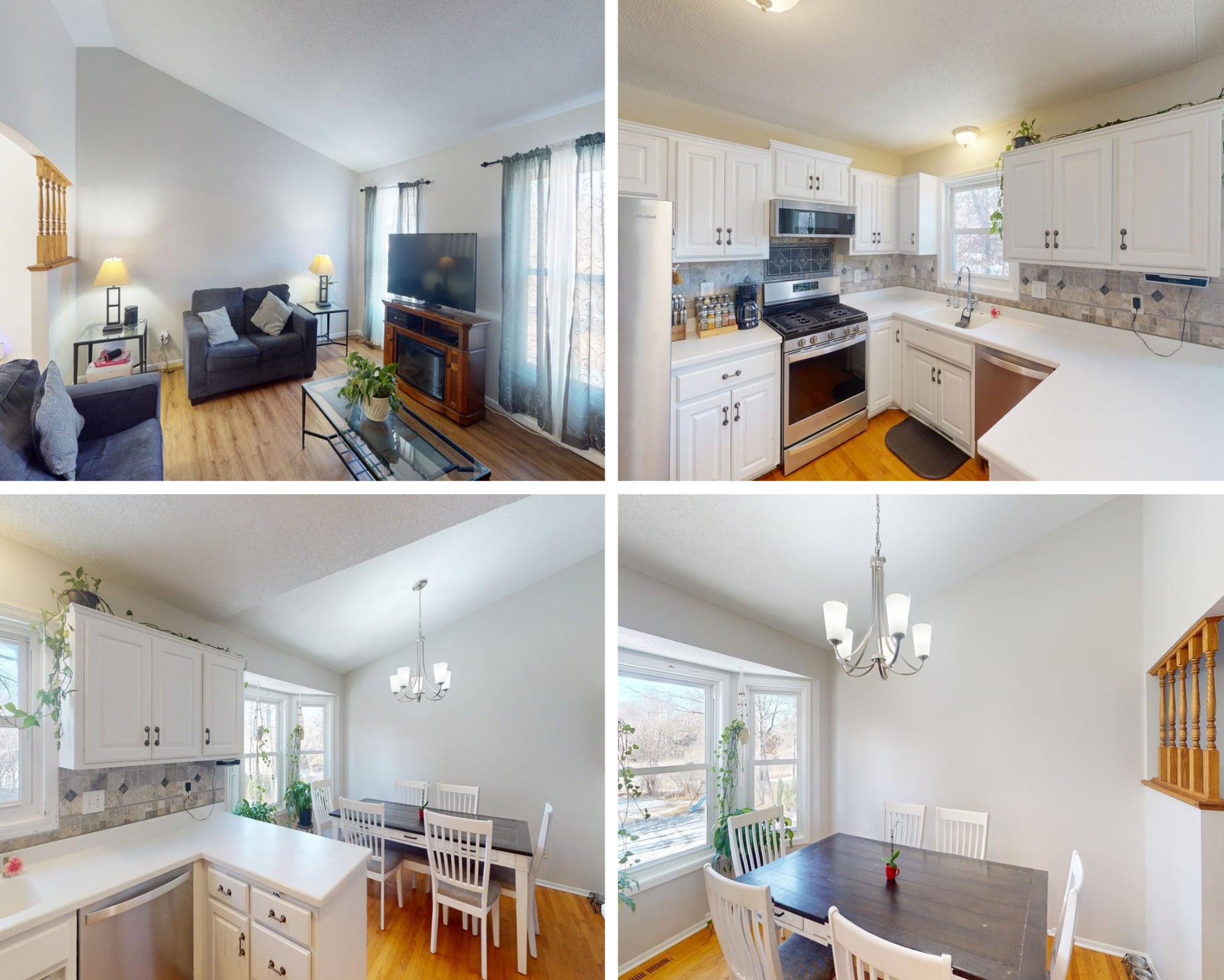 Inside, the home welcomes you with a bright main level highlighted by vaulted ceilings and warm hardwood flooring. The spacious kitchen serves as the heart of the home, featuring Corian countertops, a ceramic tile backsplash, white enameled cabinetry, stainless steel appliances, and ample prep and storage space. The hardwood floors flow seamlessly into the dining area, which opens to the inviting living room, creating an ideal layout for entertaining and everyday living. The primary bedroom also features hardwood flooring, adding warmth and timeless charm. With four total bedrooms, the home provides flexibility for guests, a home office, or growing households.